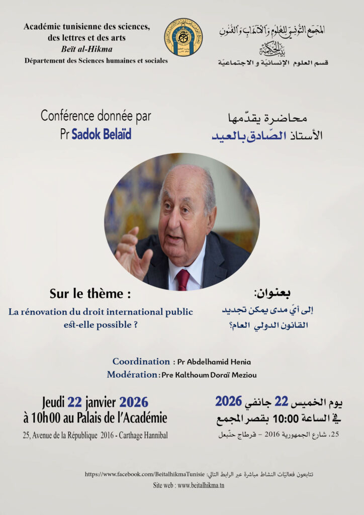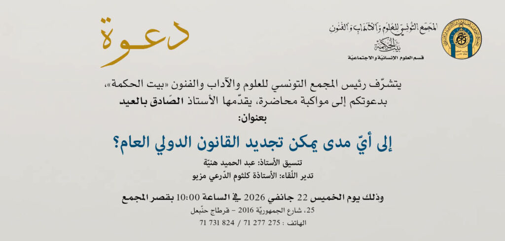 محاضرة بعنوان : إلى أيّ مدى يمكن تجديد القانون الدولي العام؟ للأستاذ الصادق بالعيد – 22 جانفي 2026