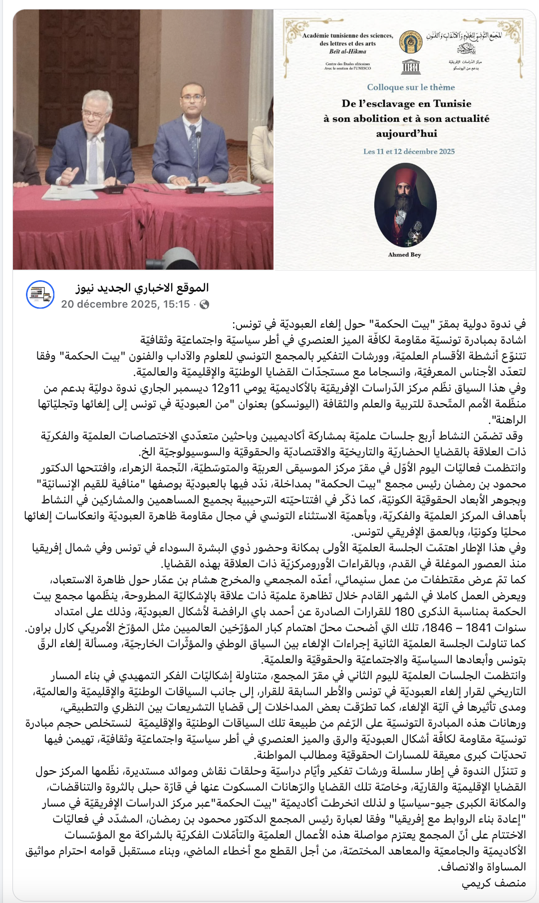 Le Centre des Études africaines relevant de l’Académie tunisienne des sciences, des lettres et des arts, « Beït al-Hikma », a organisé, avec le soutien de l’UNESCO, les jeudi 11 et vendredi 12 décembre 2025, un colloque sur le thème « De l’esclavage en Tunisie à son abolition et à son actualité aujourd’hui ».