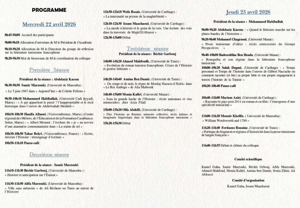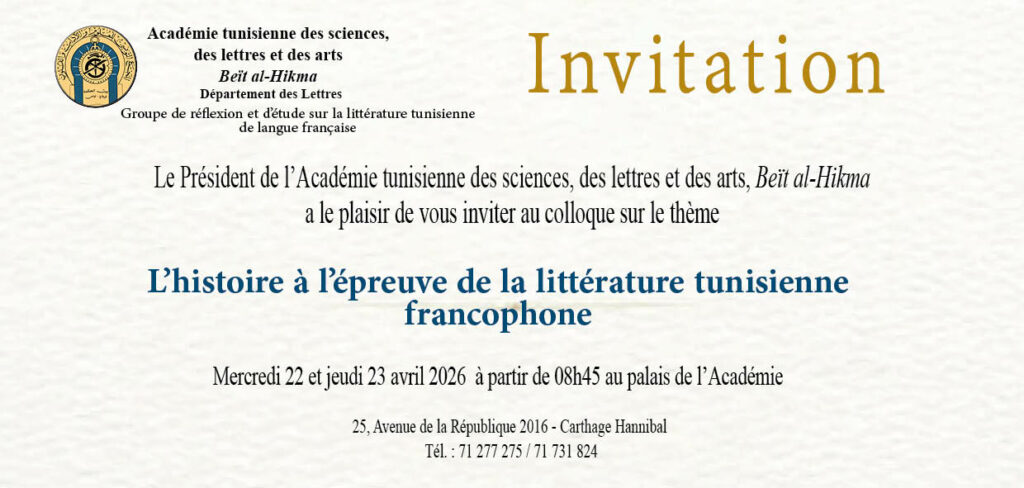 Colloque sur le thème : L’histoire à l’épreuve de la littérature tunisienne francophone 22-23 avril 2026